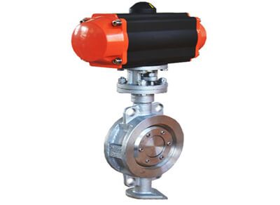 對夾式氣動硬密封蝶閥由金屬偏心蝶閥和電動執行器組成,可實現開關量和模擬量調節式兩種控制方式。金屬偏心蝶閥閥桿軸線與蝶板密封面間偏置一個尺寸A,并與閥體通道軸線偏置一個尺寸B,閥座回轉軸線與閥體通道軸線形成一個偏心角α,故形成三偏心。蝶閥從0°~90°開啟時,蝶板密封面會在開啟的瞬間立即脫離閥座密封面,在其90°~0°關閉時,只有在關閉的瞬間,其蝶板圓錐形密封面才會接觸并壓緊閥座圓錐形密封。所以閥座與蝶板上的密封面之間無任何摩擦,去除了磨損和泄漏的可能性。